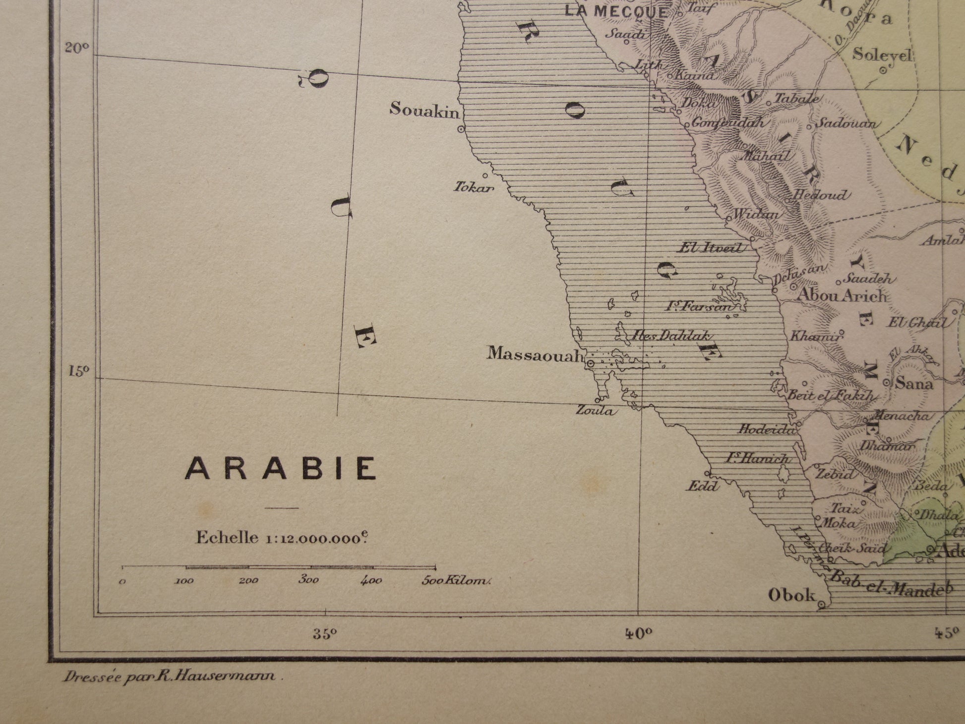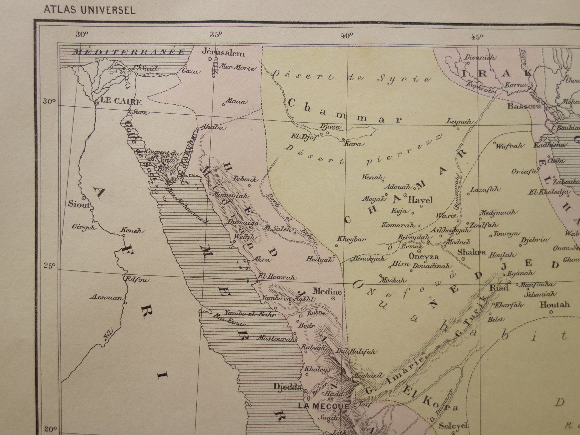 Charmante oude kaart van Saoedi-Arabië en naburige landen uit het jaar 1896. Deze Franse kaart is met de hand ingekleurd.