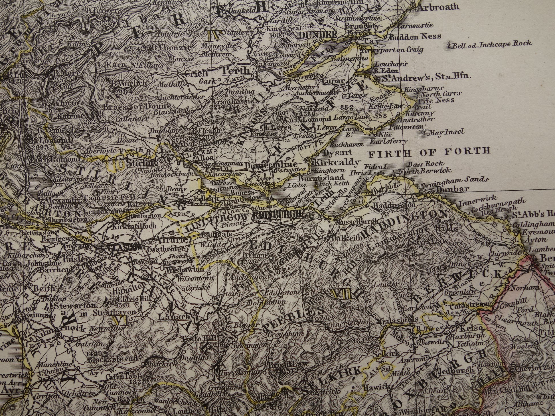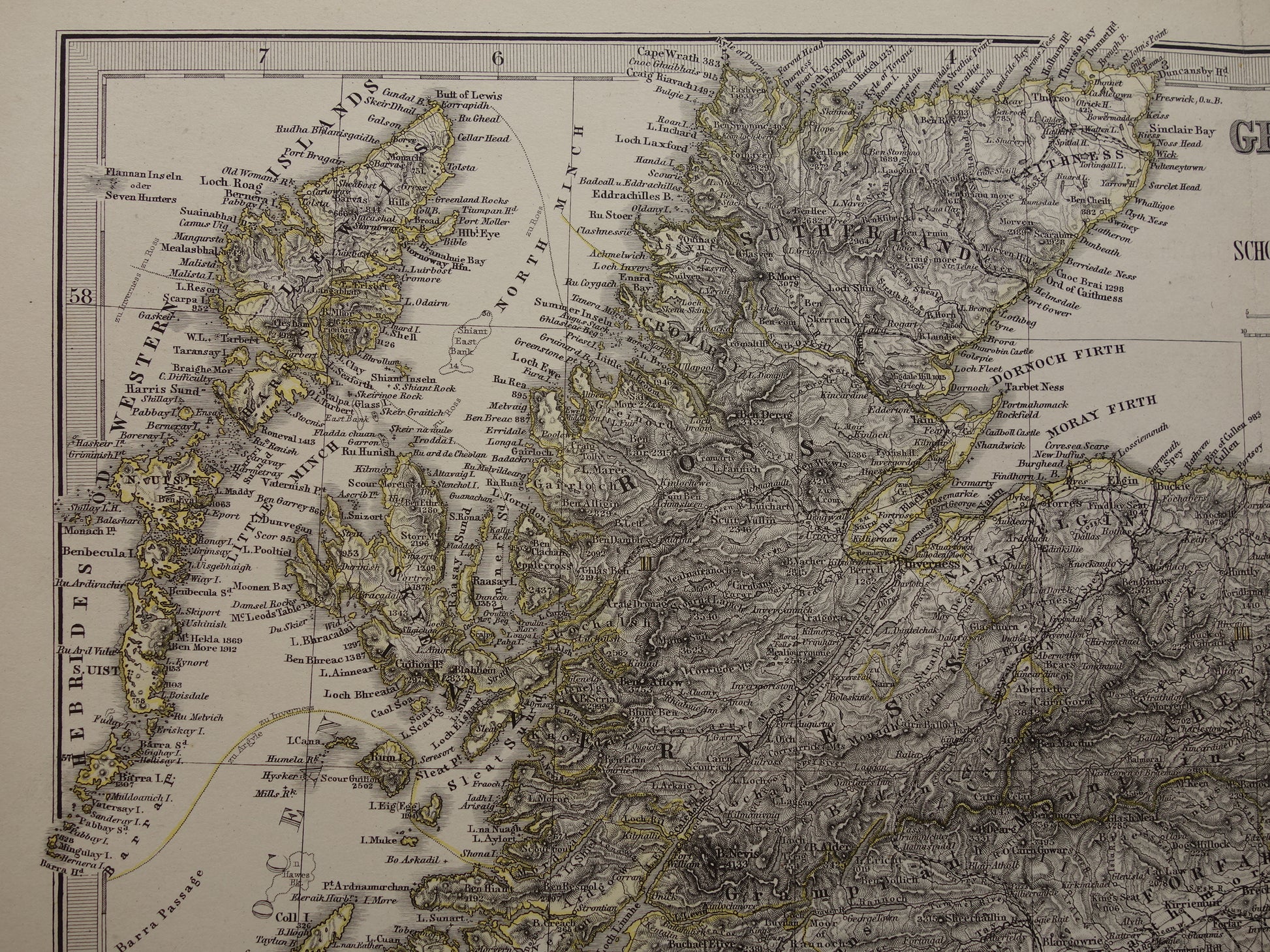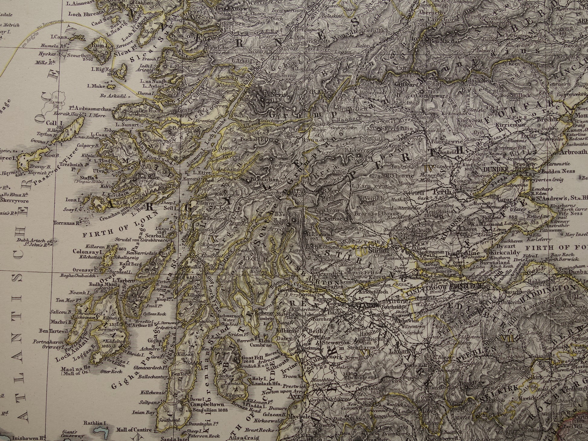 Mooie handgekleurde antieke kaart van Schotland in het jaar 1878. De kaart is kleurrijk en zeer gedetailleerd, zoom de foto's om dat goed te zien. Aan de rechterkant een inzetkaartje van Edinburgh en omgeving, daarboven een kaart van de Shetland eilanden. Onder de kaart staat het jaartal 1878. Mooie ruime marges rondom, zeer geschikt om in te lijsten.