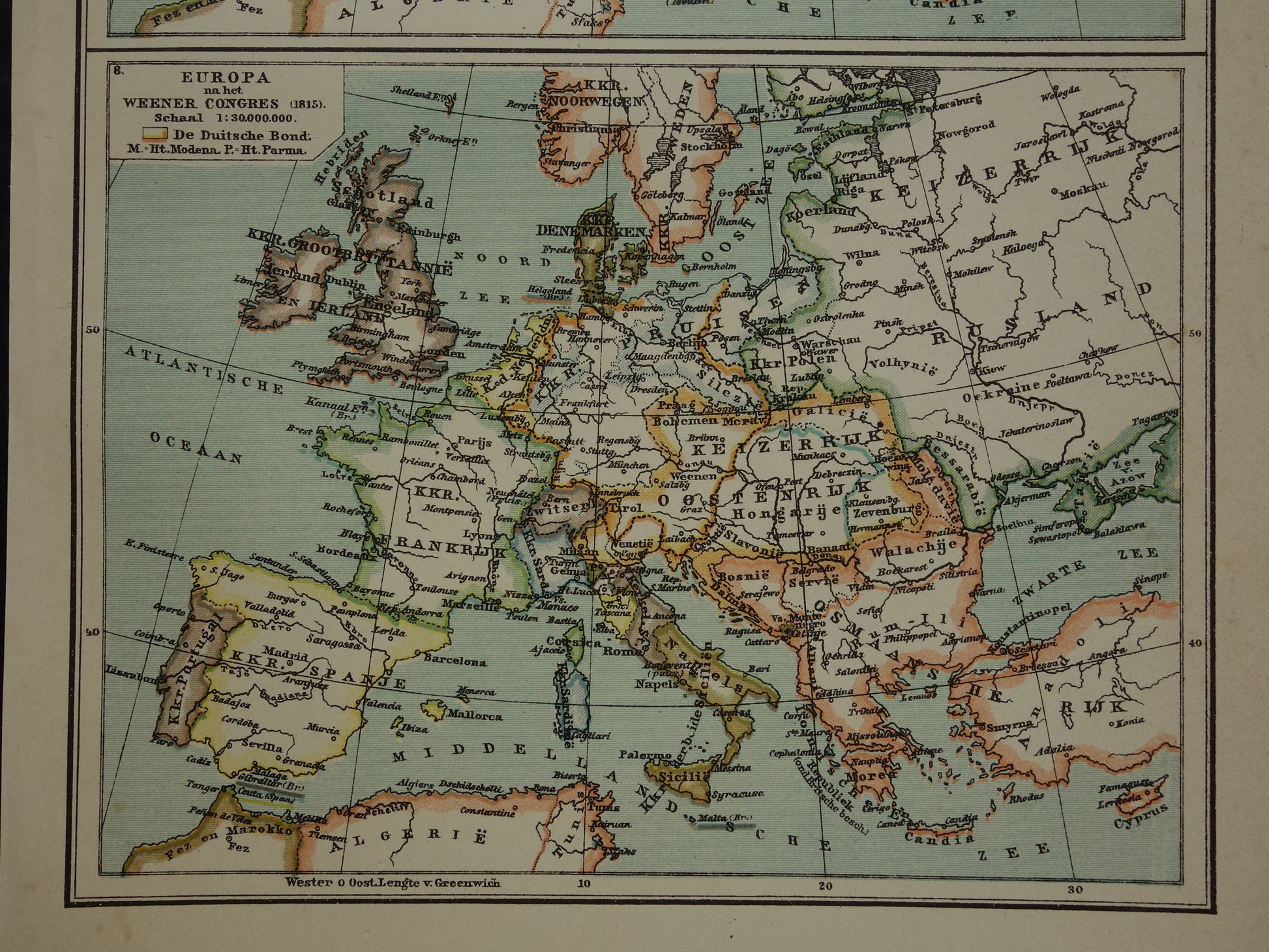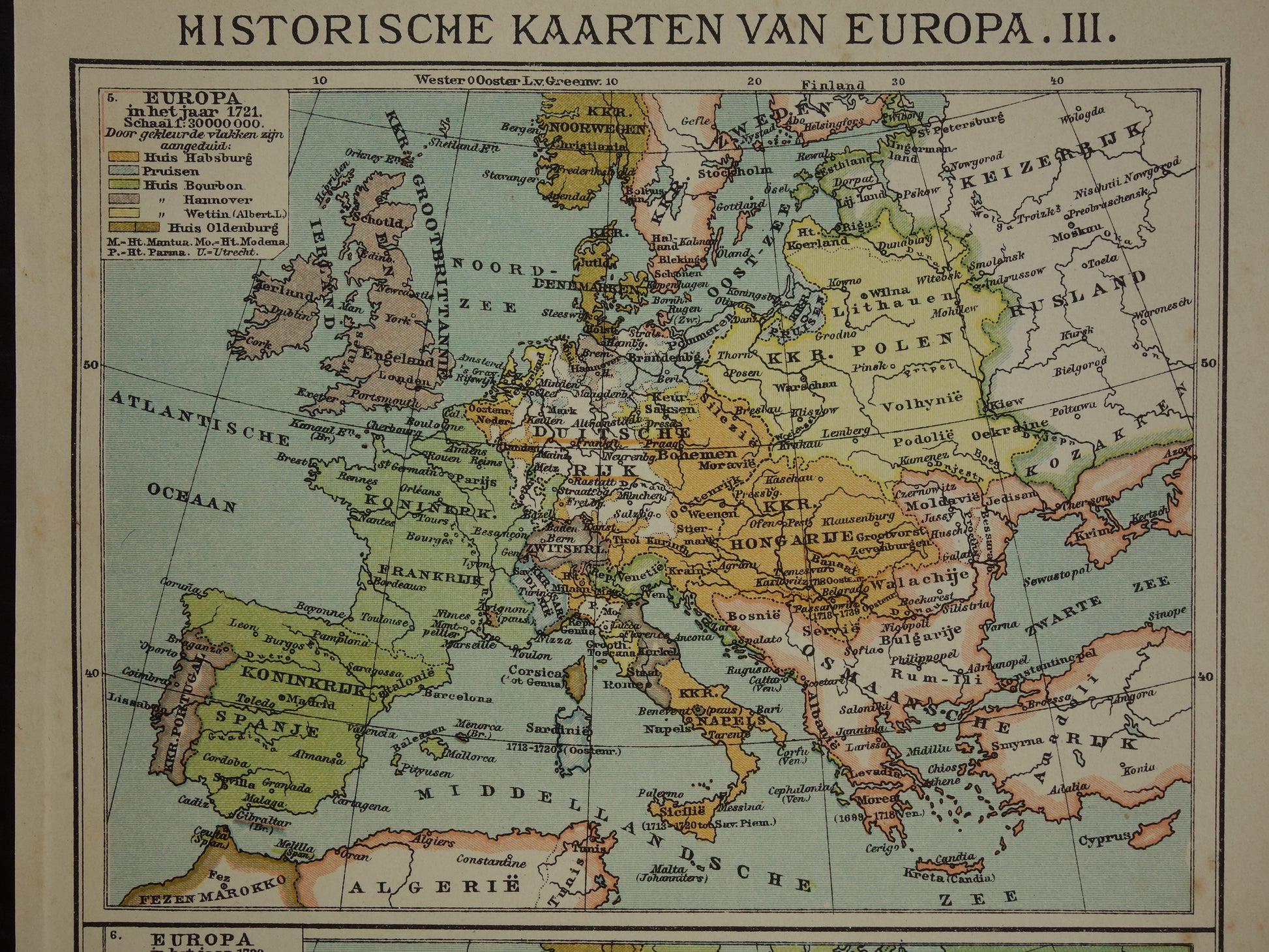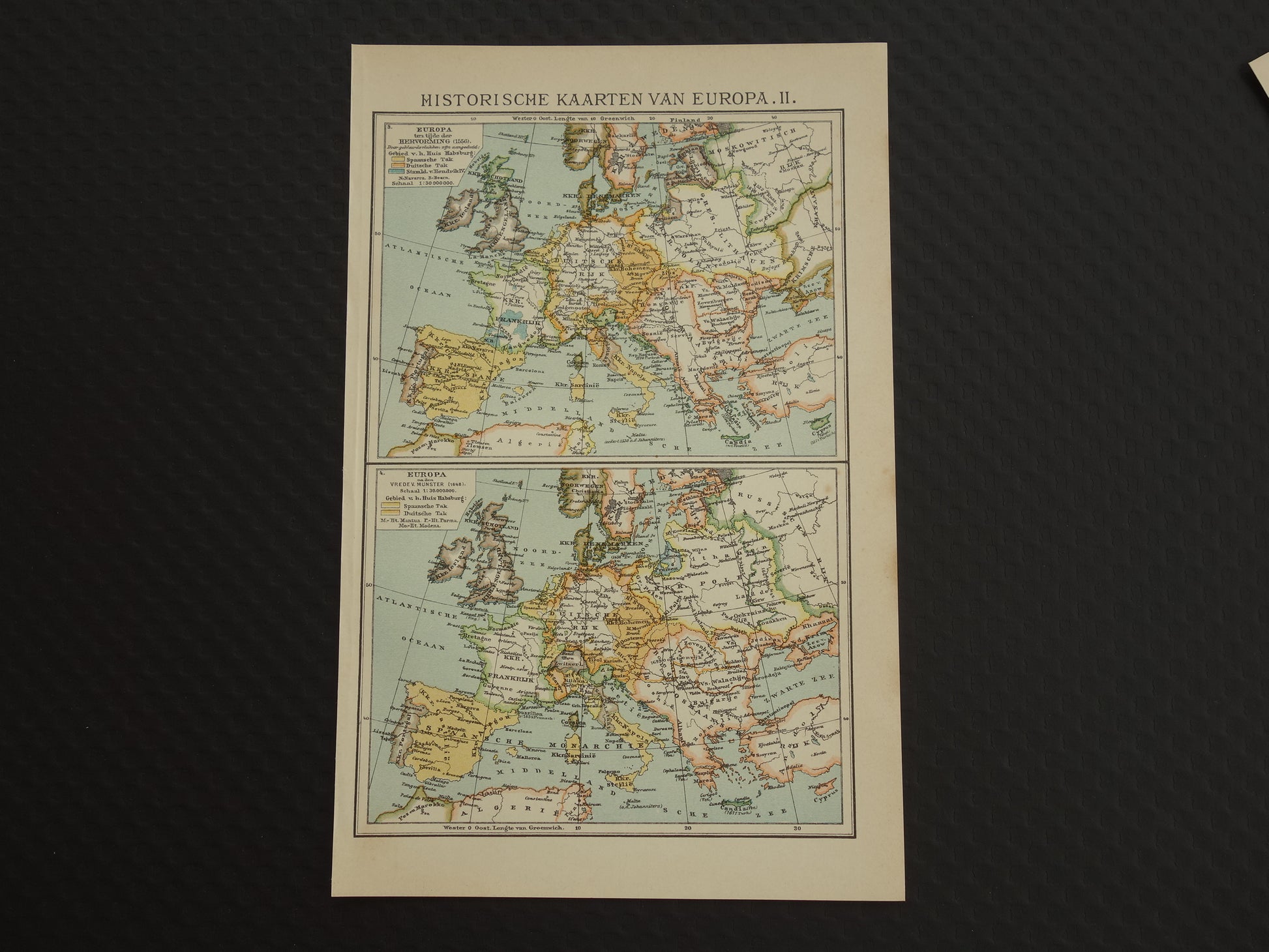Te koop is een set van kleine antieke Nederlandse kaarten over de geschiedenis van Europa (acht kaarten in totaal op 4 bladen). De kaarten laten Europa zien in het jaar 476 (de val van het Romeinse Rijk) tot en met Europa na het congres van Wenen (1815). Onder andere ook kaartjes van het jaar 1789 en van het grootste Napoleontische rijk. Mooie, kleurrijke kaarten.