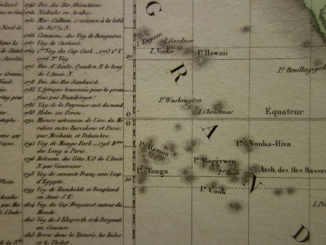 Originele antieke Franse wereldkaart met fraaie kleuren. De tekst gaat over de geschiedenis van de cartografie.