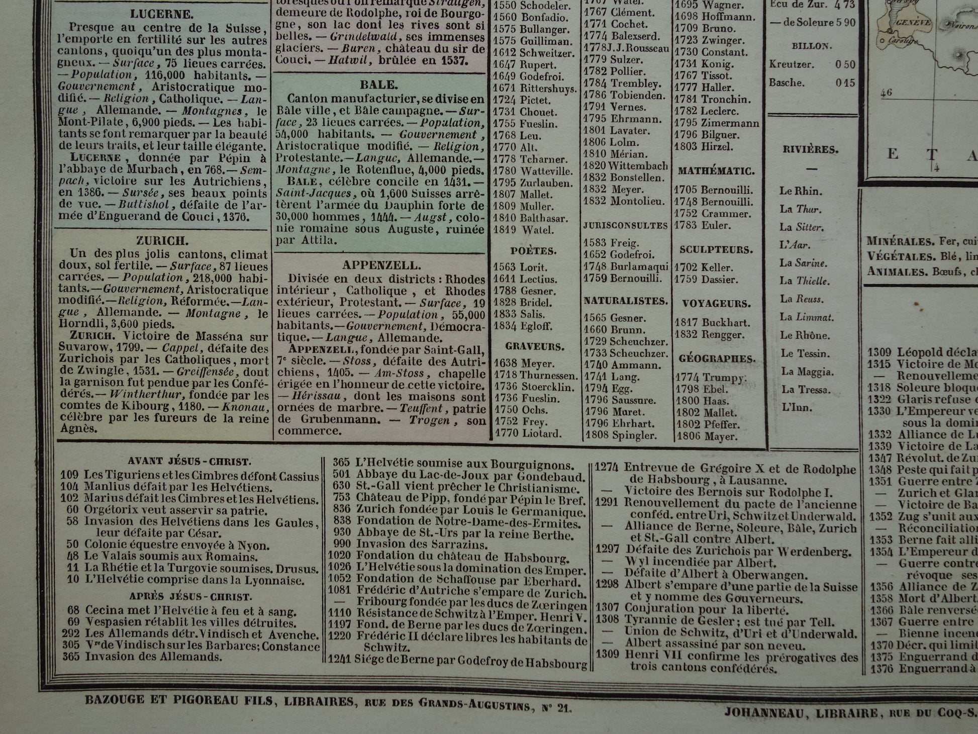 Te koop is een mooie Franse gravure over de geschiedenis van Zwitserland. De gravure is erg mooi ingekleurd (met originele handkleuring) en gedecoreerd met een kaart van het gebied. Daarnaast bevat deze gravure een schat van informatie over de geschiedenis van Zwitserland. Zoom de foto's om dit goed te zien. Een aantal voorbeelden: